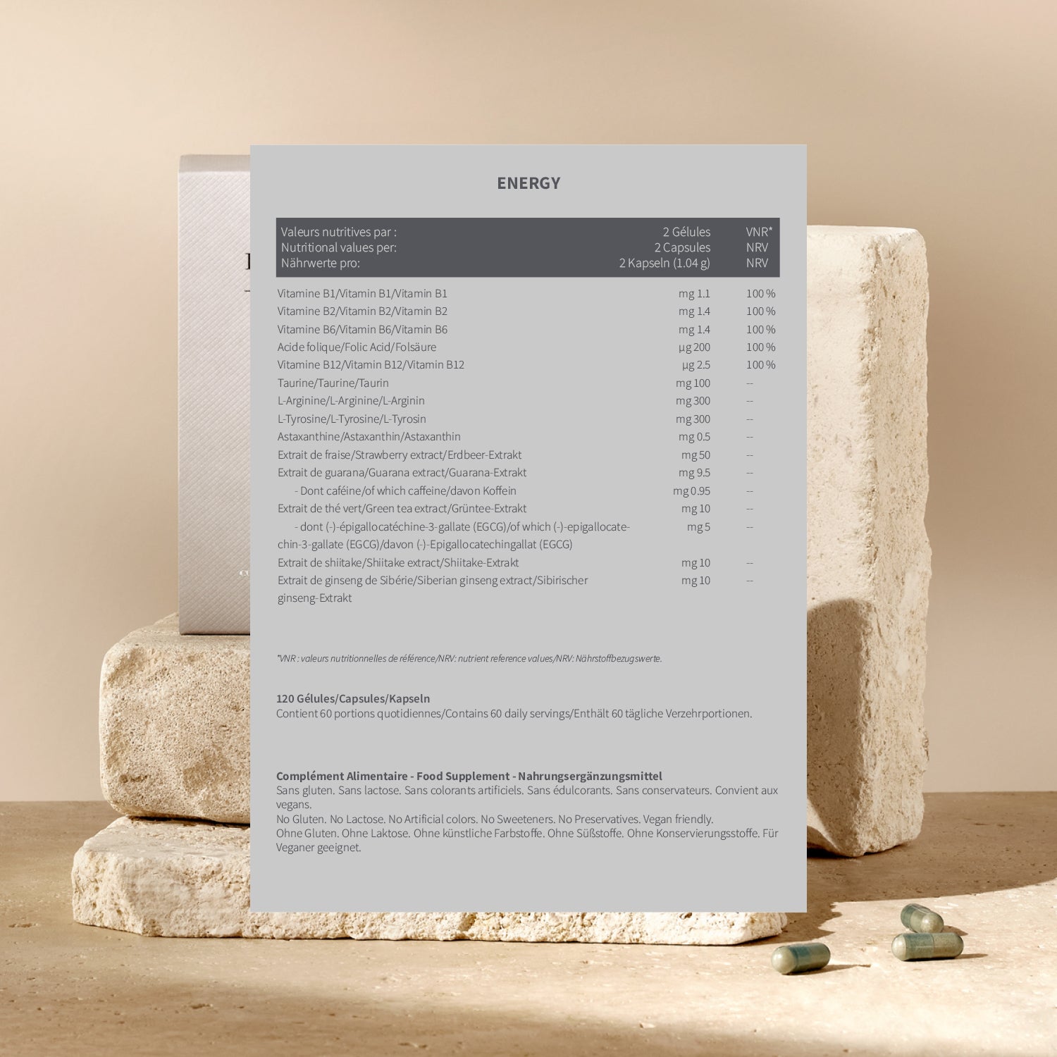 Application Take 2 capsules daily with water, preferably in the morning during or just after a meal. Do not exceed recommended dose. Not a substitute for a varied/balanced diet. For adults only. Consult a healthcare professional if pregnant, breastfeeding, or on medication. Contains caffeine – not recommended for children or pregnant women (caffeine content per daily dose: approx. 50 mg from guarana). Store below 25°C, dry, away from light.