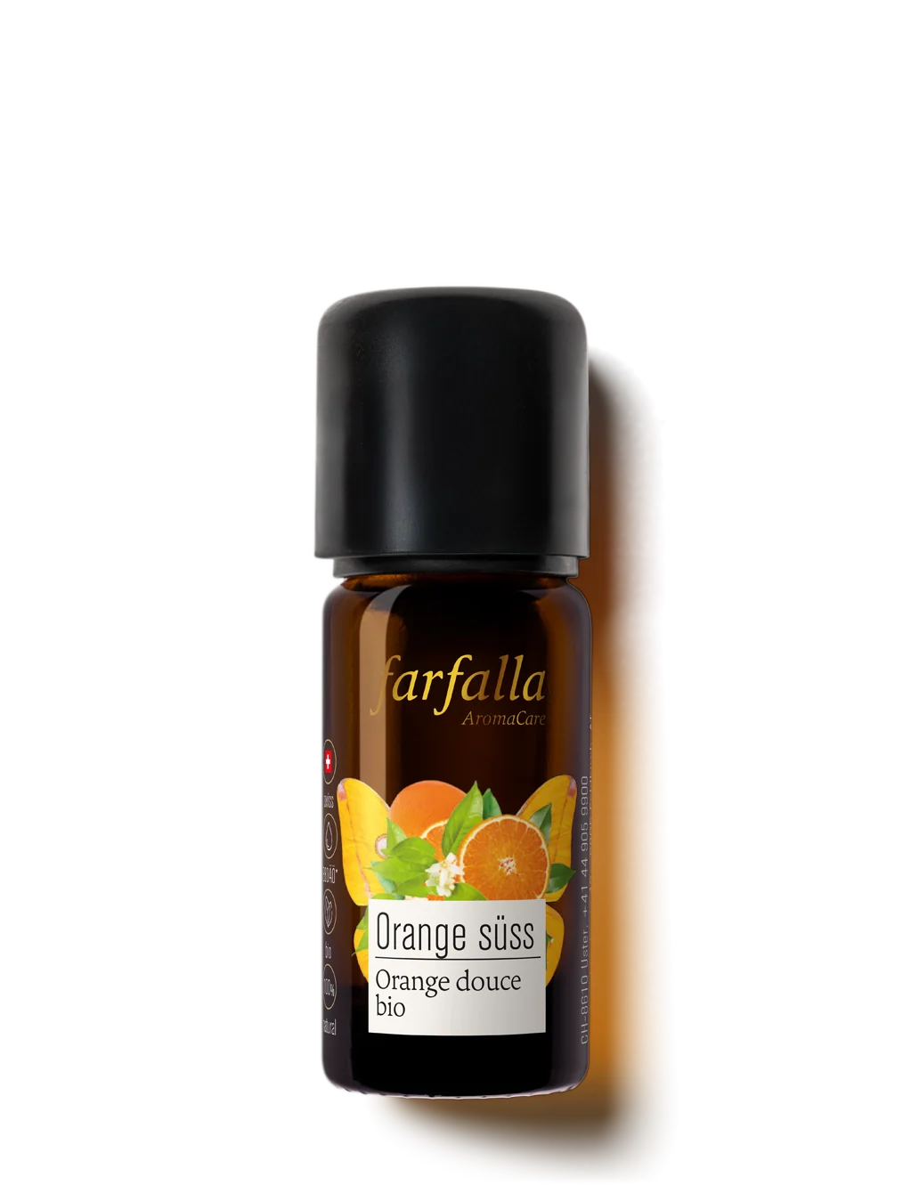 This organic sweet orange essential oil by Farfalla is obtained from the peel of organically grown sweet oranges using gentle cold pressing. The oil features a fresh, fruity citrus aroma characteristic of sweet orange and is suitable for aromatic applications.